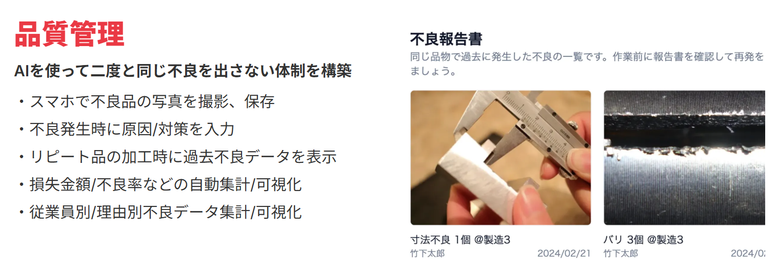 品質管理では不良品の写真記録、不良率や損失金額の自動集計が可能。工程管理では、各工程の進捗・時間管理をスマホ入力で簡単に共有。LINEやSlackとの連携により、不良発生や出荷準備完了時にはリアルタイム通知が可能。モダンでやる気を引き出すデザイン性にもこだわっており、直感的に操作できる点が高評価を得ています。