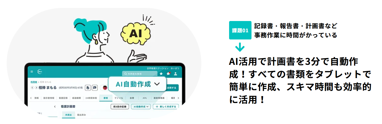 iBowは、訪問看護に関わる業務全体をカバーする電子カルテ。AIを活用して計画書作成を大幅に時短し、タブレット操作で記録を簡単に作成。請求業務も医療・介護保険の双方に対応しており、返戻や請求漏れを削減できる機能が備わっている。全ての書類が一元管理され、チームでの情報共有もスムーズに。