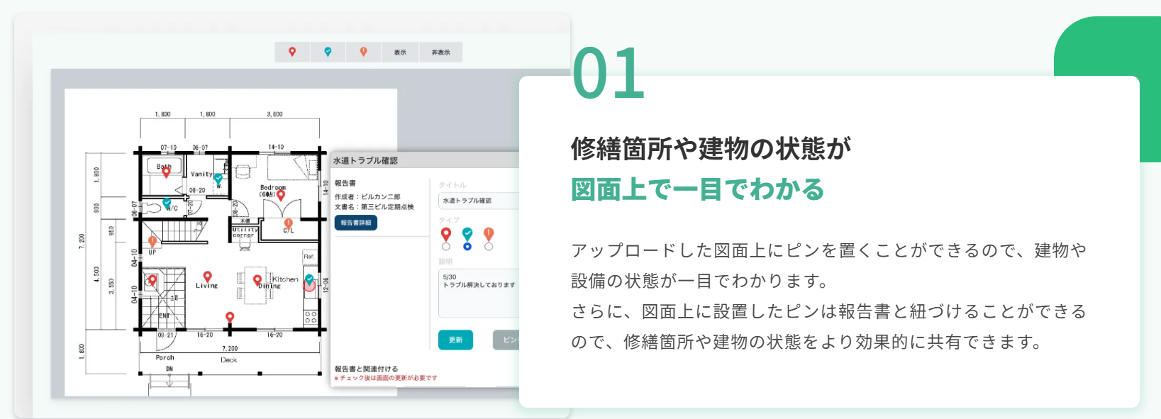 ビルカンでは、図面上に設備や修繕情報をピンで記録し、報告書と連携可能。ノーコードでフォーマットを作成し、画像やPDFの一括管理も可能。紙での報告書をスマホで撮影するだけでデジタル化できるBPO支援機能もあり、業務の標準化・可視化に貢献します。現場と本部間の情報共有もスムーズに。