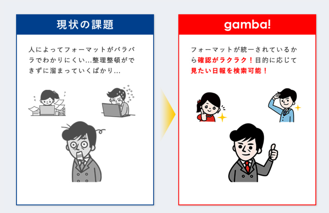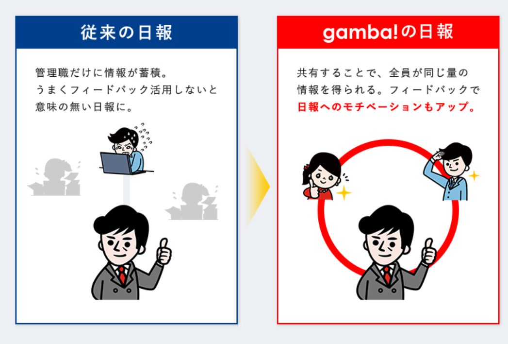 gamba!は、日報テンプレートに従って3ステップで簡単に入力でき、管理者や同僚からコメントや「いいね!」が届くことで社内のコミュニケーションが自然に活性化。SNS感覚で情報共有ができるため、面倒な報告業務が“価値ある交流”に変わります。さらに、全社員の日報がタイムライン形式で表示され、現場の声をスピーディーに把握可能。部門を超えた理解と協力が生まれ、組織の連携力を高めます。
