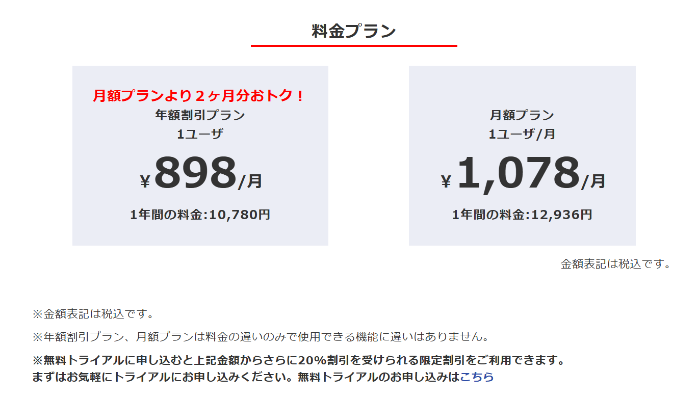 1ユーザー月額898円〜(初期費用0円/15日間無料トライアルあり)