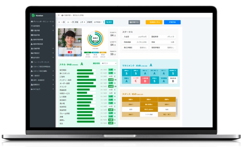 Newtonは、飲食店経営の現場ノウハウを基に開発された、タレントマネジメント+人事評価システムです。評価項目が教育カリキュラムとして活用でき、役職ごとに異なる基準を設定可能。自己評価と上司評価をデータ化し、即座にグラフ表示できるほか、紙やExcelからの脱却で業務のDX化を支援。人事評価から教育、給与設計までを一元管理し、作業効率と人材定着率の向上を図ります。