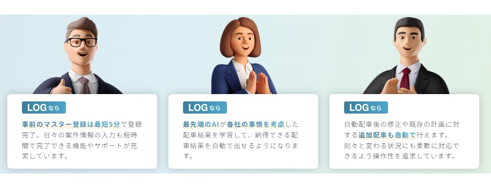 LOGは、物流現場で“本当に使える”ことを追求して開発されたAI配車アシスタントです。最先端のAIと独自の最適化エンジンにより、複数拠点・リアルタイム修正・追加配車に対応可能。電話対応しながらの入力やExcel一括取込も可能なUIを備え、現場と経営の双方を支援します。配車業務の属人化を防ぎ、CO2排出量の可視化なども可能。実運用を重視した現場密着型の設計が強みです。