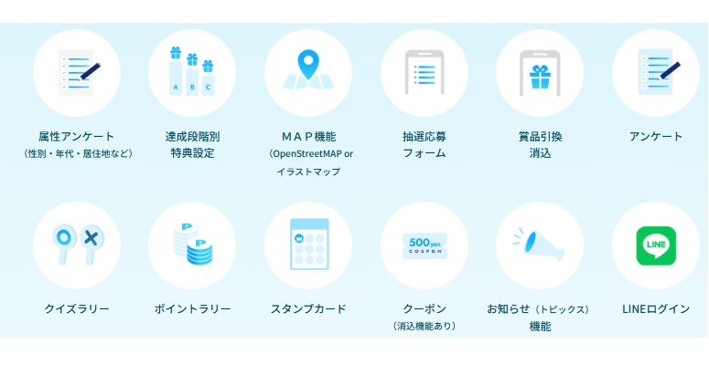 QRコード、GPS認証、NFCタグ、キーワード入力、クイズ方式など多彩なスタンプ取得方法を選択可能。ユーザー属性やスポット特性に合わせた最適設計で参加率を最大化。見やすく操作しやすいマップUI、LINEログイン連携、複数スポット達成特典、スポット別クーポン、抽選応募機能などエンゲージメントを高める機能が標準搭載されています。