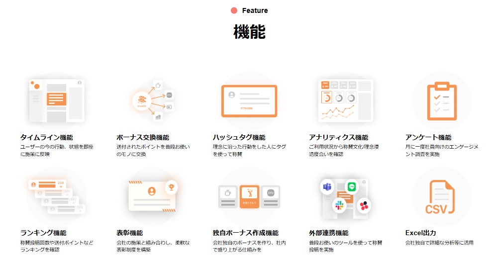 ハッシュタグによって企業理念や行動指針に基づいた行動を可視化・分類できるため、ただの“感謝ツール”にとどまらず、理念浸透や行動改革にも貢献。アナリティクス機能で利用率・タグ別推移・ランキングなども確認でき、部門別の称賛傾向やカルチャーギャップも分析可能。月次アンケートとの連携で、エンゲージメント診断としても活用できます。
