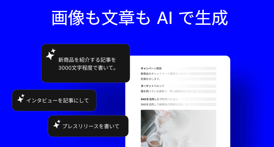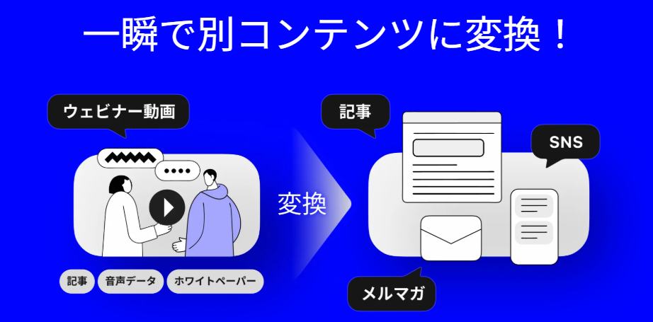 Markは、ブログ、SNS、メルマガ、ホワイトペーパー、ウェビナー資料など、幅広いマーケティングコンテンツをAIで生成・変換することで、制作時間と人手を大幅に削減するツールです。ブランドのトーンや世界観を学習させることで、高品質で一貫性のあるアウトプットが可能になります。生成だけでなく、調査・レビュー・企画立案にも対応し、プロジェクト全体の生産性を高めます。
