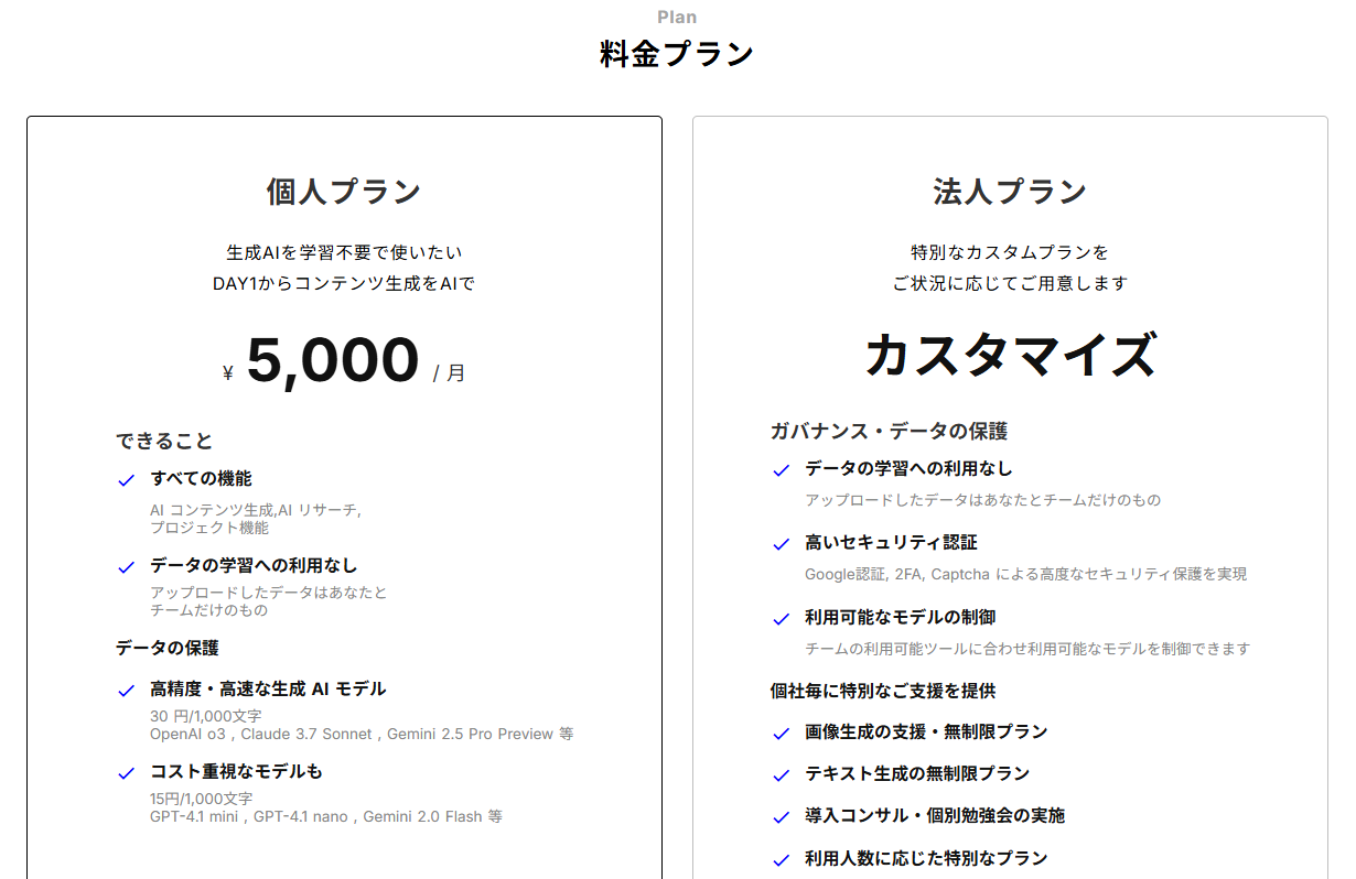 個人プラン:5,000円/月〜(従量課金:15〜30円/1,000文字)、法人プランは個別見積もり
