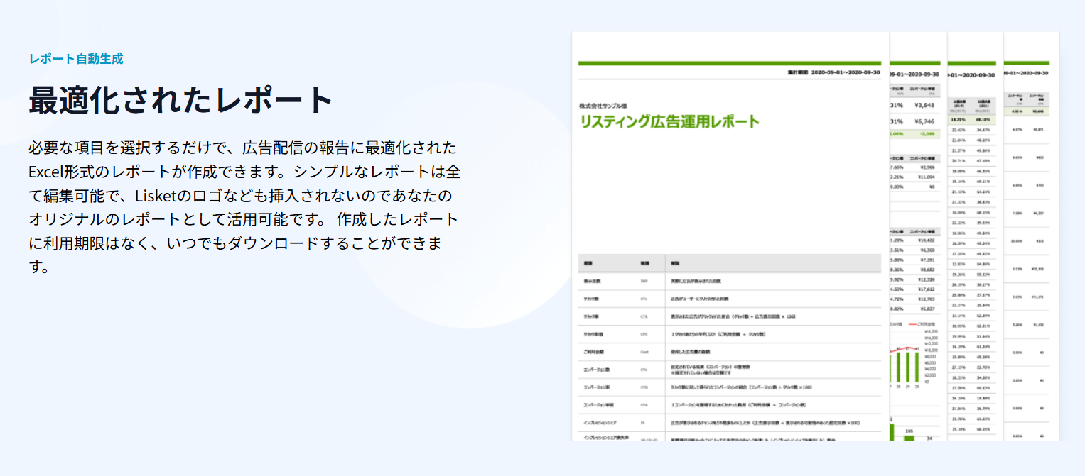 Lisketでは、広告配信の結果レポートをExcel形式で自動生成。複数媒体のデータを一括で収集し、必要な項目だけを選んでレポート化できます。毎月数十時間かけていた作業が不要となり、クライアントへの報告も迅速・的確に。編集可能でロゴも非表示にできるため、自社オリジナルのレポートとして活用可能です。