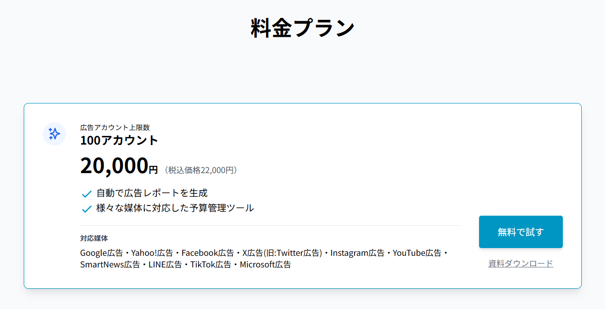 月額20,000円(税込22,000円)〜/アカウント数に応じた料金変動、初期費用なし、契約期間縛りなし
