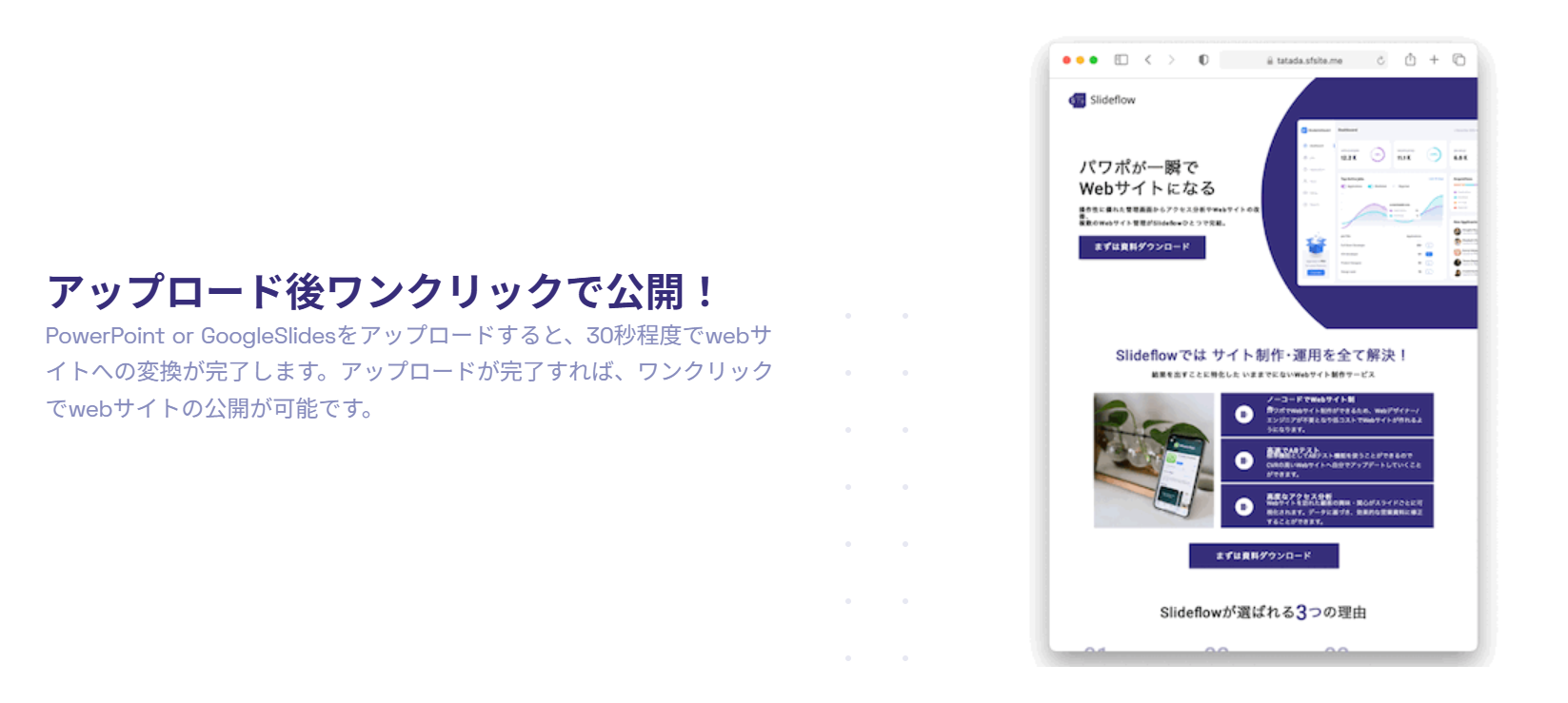 Slideflowは、PowerPointやGoogleスライドをアップロードするだけで、HTML/CSSへ自動で変換され、ワンクリックでWebサイトとして公開可能です。面倒なコーディングは一切不要で、誰でも簡単に本格的なホームページが作成できます。リンク設定やエフェクトも直感的に操作でき、プレゼン資料からすぐにサイトへ転用できるため、業務効率が大幅に向上します。