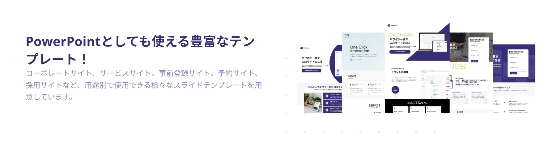 Slideflowには、コーポレートサイトやランディングページなど用途別テンプレートが多数用意されており、スライド作成感覚で使える点が魅力です。さらに、問い合わせフォームやアクセス分析ツールも標準で搭載されており、Webサイトとしての機能性も万全。生成されたサイトはソースコードの書き出しが可能で、自社サーバー運用にも対応できます。
