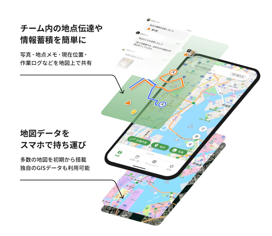 LivMapは、複数人での地図情報共有を目的としたクラウドサービスです。現地調査、営業活動、保守点検など、地理情報が重要な業務において、リアルタイムでの情報共有とチーム間の連携を支援。地図上にピンを立ててタスクやメモを残せるなど、地理的な視点から業務を見える化できます。