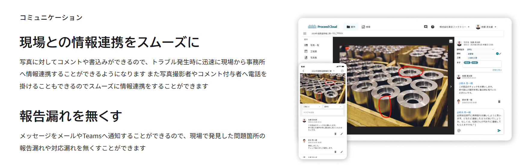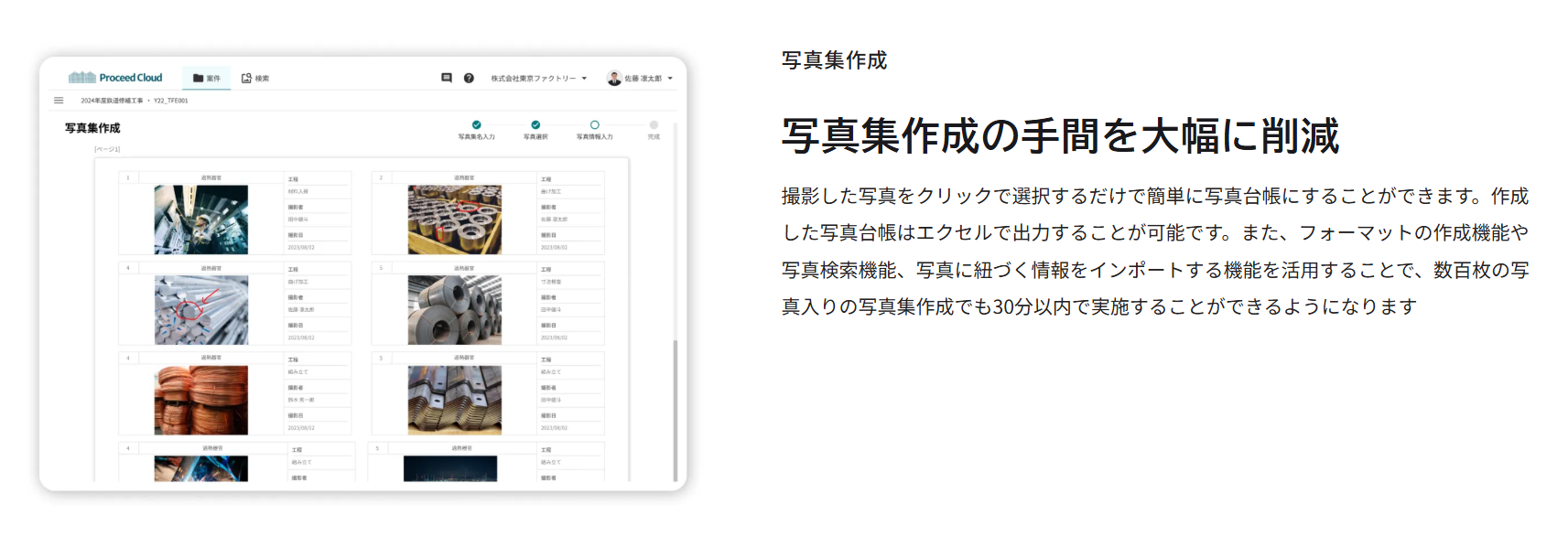 Proceedクラウドは、製造現場の工程写真をベースに製造情報データベースを簡単に構築できるクラウド型SaaSです。スマホやPCで撮影・アップロードするだけで、部材×工程ごとに写真を整理し、タグ付けやコメントで現場ノウハウを蓄積。進捗管理機能(特許取得)により「本日進めるべき工程」を可視化し、外注先ともリアルタイムに共有可能。技能伝承、進捗把握、報告業務の効率化に貢献します。