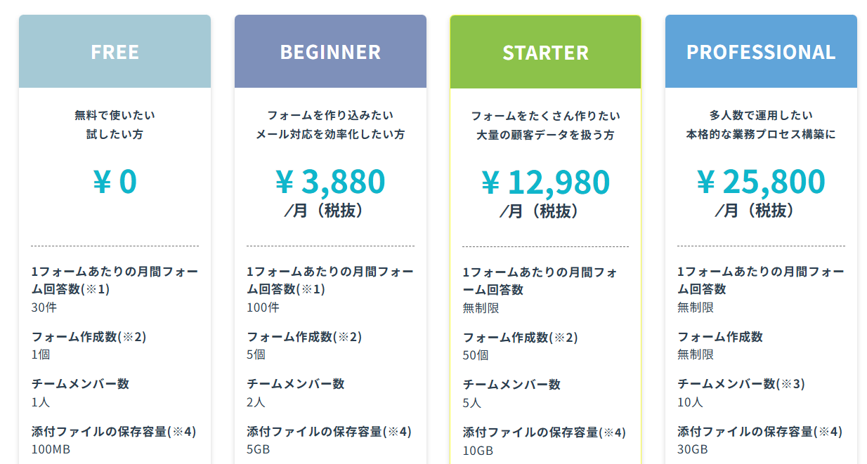 初期費用なし、無料プランあり(フォーム1つ・月30回答・100MBストレージ)、有料プランは月額3,880円〜25,800円など段階制、14日間トライアルあり、フォーム単位で1,980円追加購入可。