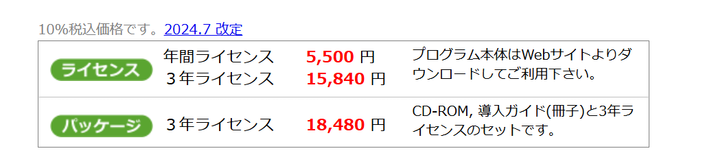 年間ライセンス5,500円、3年ライセンス15,840円。CD-ROM版やアップグレード版あり。