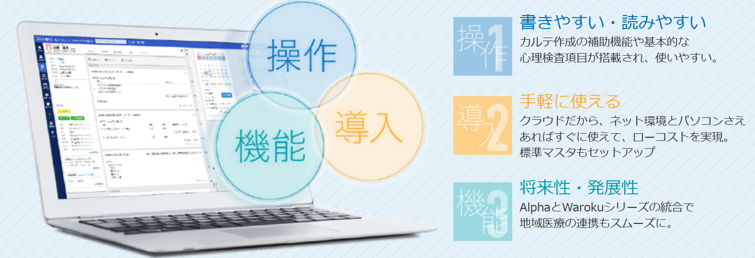 Warokuクリニックカルテは、精神科クリニック向けに特化したクラウド型電子カルテです。外来受付、診療記録、会計、次回予約まで一括サポート。テンプレート入力や心理検査項目、ワンクリック処方など、診療効率を高める機能を多数搭載。「書きやすく・読みやすく」にこだわったUIで、時系列表示により患者の経過把握もスムーズ。クラウド運用により、インターネット接続さえあれば即開始でき、BCP対応・常時最新バージョンの提供など安心運用も実現します。ASPICクラウドアワード社会貢献賞受賞の実績もあり、将来的には地域医療連携やデータヘルスにも対応するプラットフォーム設計です。