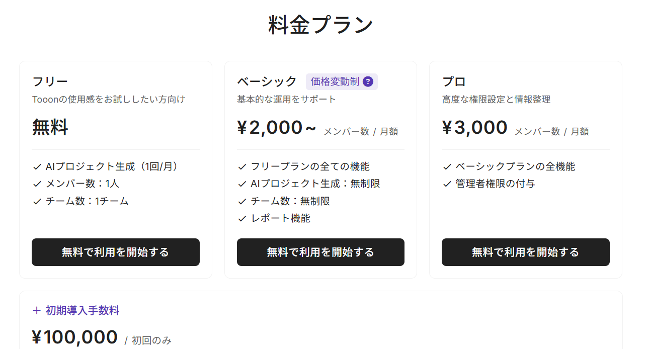 基本プランは「フリー」「ベーシック」「プロ」の3段階プラン、登録無料〜(詳細は要問い合わせ/公式サイト参照)