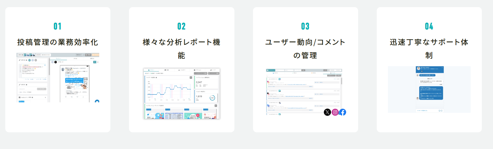 自社・競合アカウントのインサイト分析やInstagram口コミ分析、コメント・DMを一括ボックスでステータス管理し、アラートや履歴保存で炎上や対応漏れを防ぎます