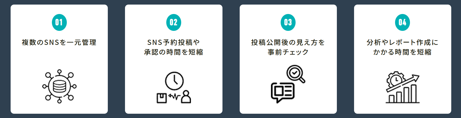 投稿予約・カレンダー表示・スマホ/PCプレビュー・最大3段階承認フローなど投稿に関する一連の業務を一元化し、Excelや手作業による運用から解放します