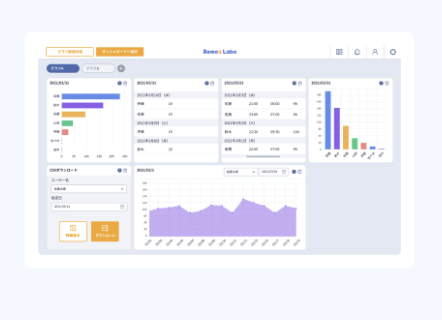 RemoLaboは、リモートワーク下で見えにくくなった勤務時間や作業内容を自動で記録し、リアルタイムで可視化する勤怠・生産性管理クラウドシステムです。PC起動時の打刻不要の勤怠管理、マウス・キーボード操作ログ、ウェブ閲覧履歴などを自動取得。残業や業務偏り、違反リスクのアラート設定や、作業状況のグラフ化・人事評価への活用まで対応します。従来の勤怠管理では見えない「働きすぎ」「休み過ぎ」を検知し、業務負担や法令遵守を支援。