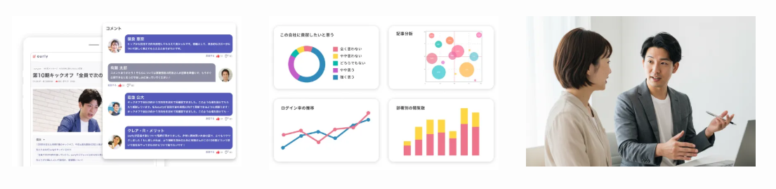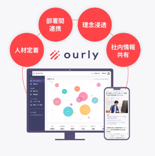 ourlyは、web・ネイティブアプリで動く社内報CMSで、SNSライクなコメント・リアクション機能と、閲覧率・読了率・役職/部署別分析など独自の分析機能を備えています。24/365の定例レポートや伴走型サポートで運用定着を支援。従業員エンゲージメントや理念浸透目的で、高い継続利用率を誇ります。