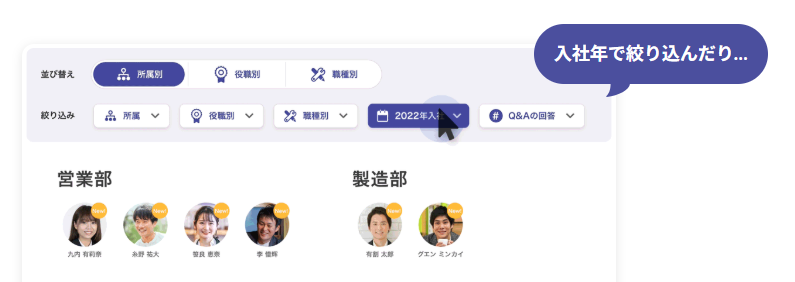 社員の顔写真付きプロフィールと組織図で、社員同士が相手の人柄や所属を直感的に理解できるため、部署や拠点の壁を超えた出会いが生まれます。