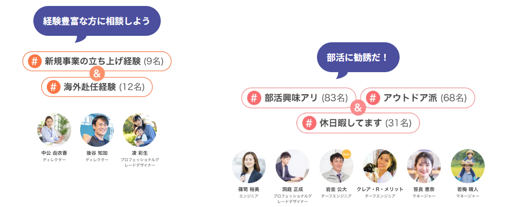 「休日の過ごし方」など会社共通のQ&Aに社員が回答することで、趣味や価値観ベースの共通話題が見え、新たな対話・関係構築のきっかけとなります。