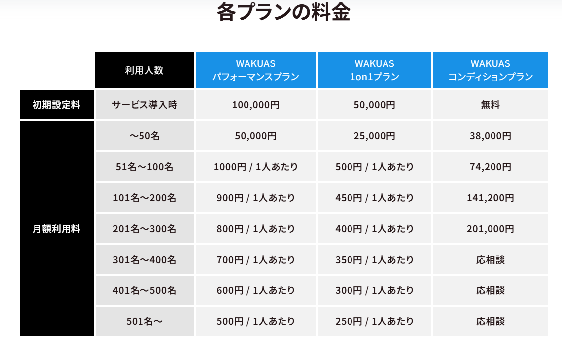 導入プランに応じた月額制(例:パフォーマンスプラン 約¥50,000~/月+初期費用¥100,000~、1on1のみプラン:約¥25,000~/月など)。詳細は要お問い合わせ。
