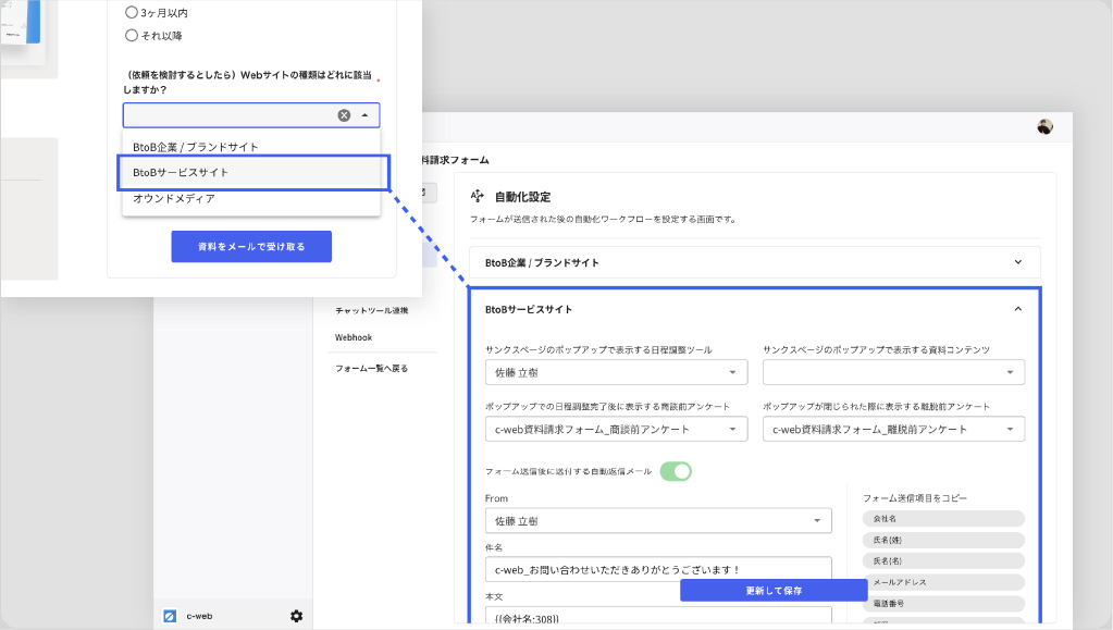 フォーム作成時の「条件分岐項目」の回答別に、サンクスページで表示する日程調整ツールや資料、自動返信メール文を変更することができ、顧客に合わせたアプローチで商談獲得数を増加。