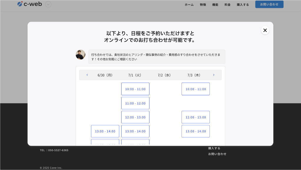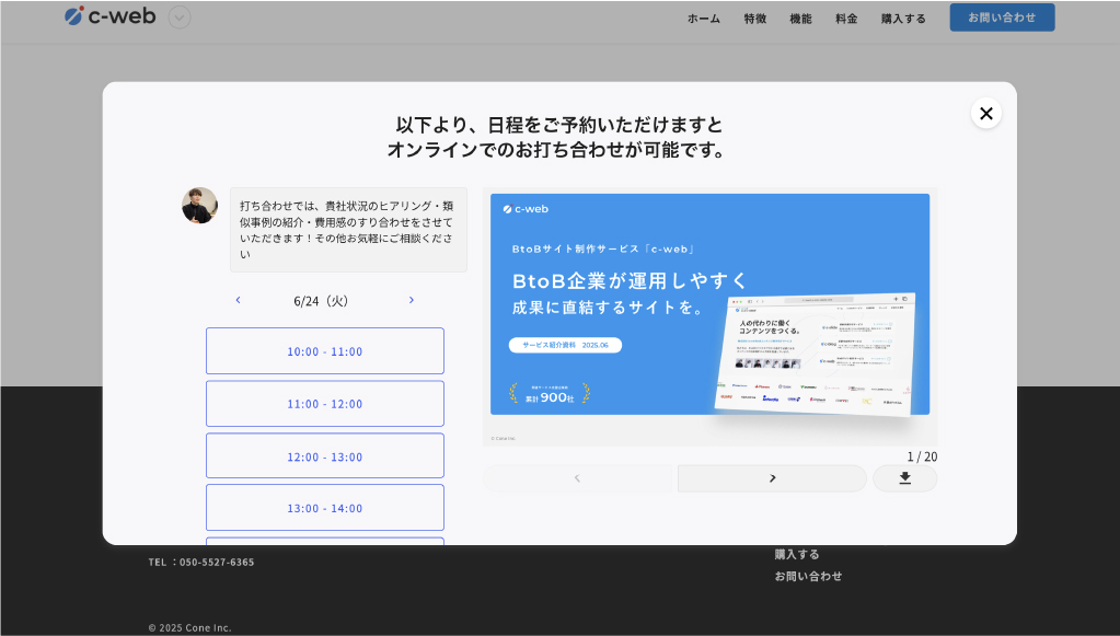 お問い合わせフォーム送信直後に、サンクスページにて日程調整ツールでWeb会議可能日程を表示することで、自動で商談獲得。24時間顧客対応が可能になり、工数削減・商談獲得数増加。