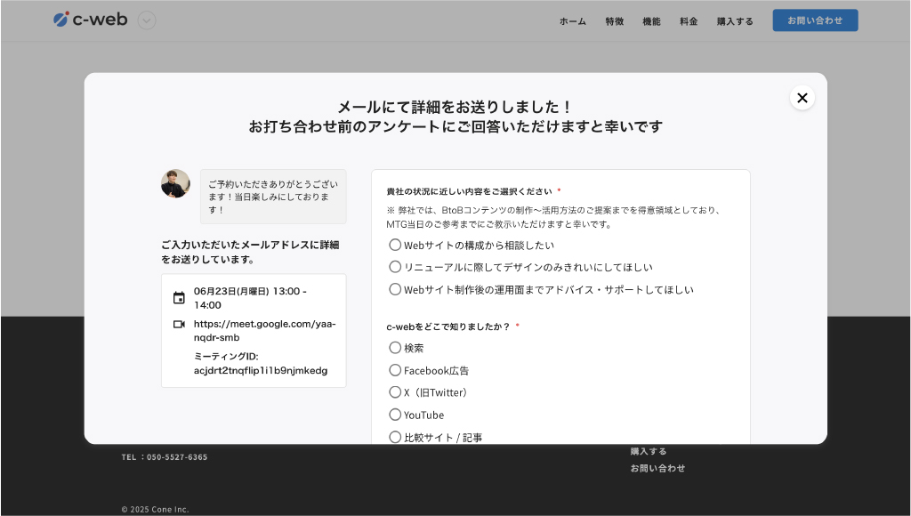 Web会議の予約完了直後に「商談前アンケート」を表示し、回答を回収できるため、商談の事前準備が容易に。これまでの架電・メールでのヒアリングよりも工数は削減、回答率は向上。