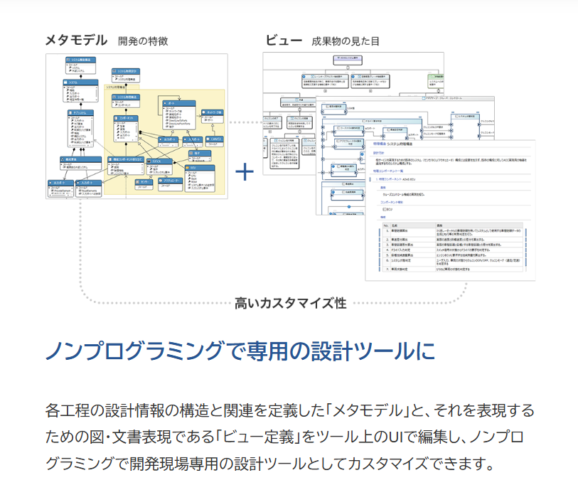 “メタモデル”(設計データ構造定義)と“ビュー定義”(表示形式)をツール上で設定することで、ノンプログラミングで現場プロセスに最適化された専用設計環境を構築できます。多様なビュー切り替えや変更同期などにより、設計現場での使いやすさと精度を確保します