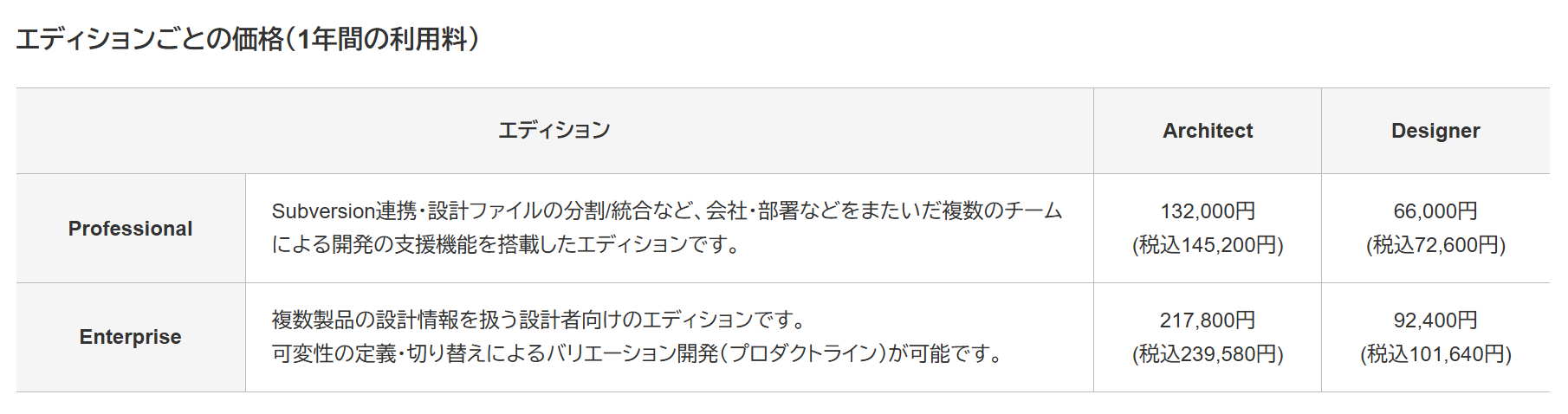 ユーザーライセンス:66,000円/年(税込72,600円)~、フローティングライセンス:264,000円/年(税込290,400円)~。無料評価版(90日間)あり