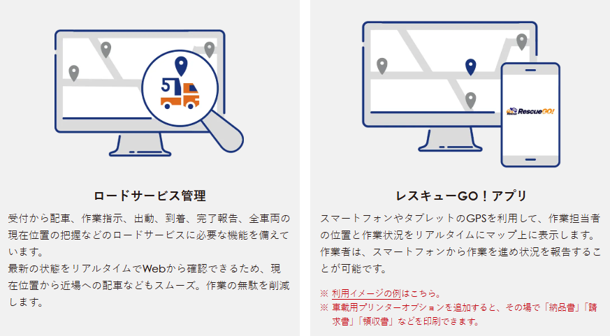 「レスキューGO!」は、ロードサービス業務に特化したクラウドとスマートフォンアプリで構成されるDXシステムです。受付から配車、作業指示、出動・到着・完了報告、請求処理、入金確認、そして作業・勤務状況の一元管理に対応し、リアルタイムな見える化を通じて業務の効率化と品質向上を支援します