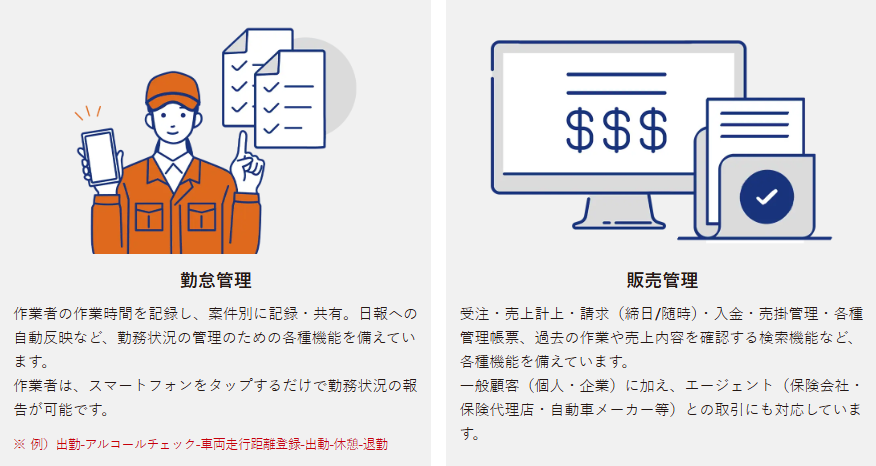 スマホやタブレットのGPSで作業者の位置と作業状況を地図上で可視化。さらに、車載プリンターオプションを利用すれば、その場で納品書・請求書・領収書の印刷も可能。勤怠管理や売上・請求・入金・売掛管理などの販売管理機能も備わり、現場と事務の連携を強化します