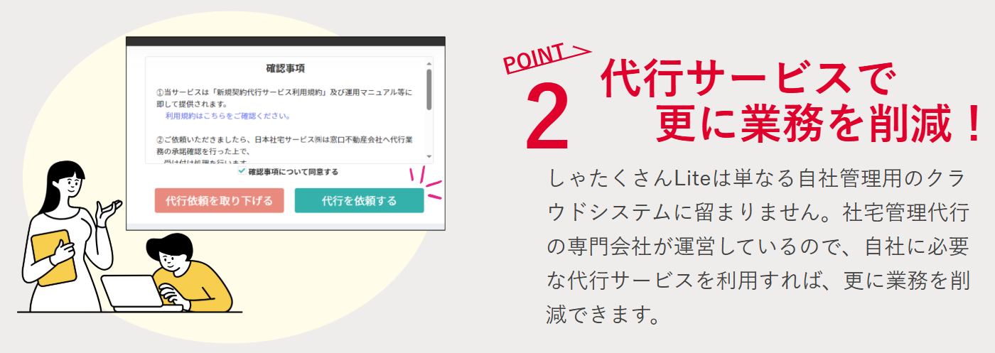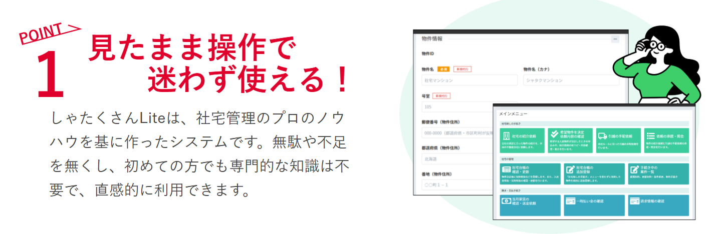 「社宅さんLite」は、社宅管理業務に関する煩雑な手続きをクラウド上で一元管理できるサービスです。物件情報・入居者情報・契約更新のスケジュールなどを簡単に可視化できる管理画面を提供し、業務の抜け漏れや人為的ミスを防止。入力フォームや通知機能も備えており、日々の管理業務を効率的に進められます。