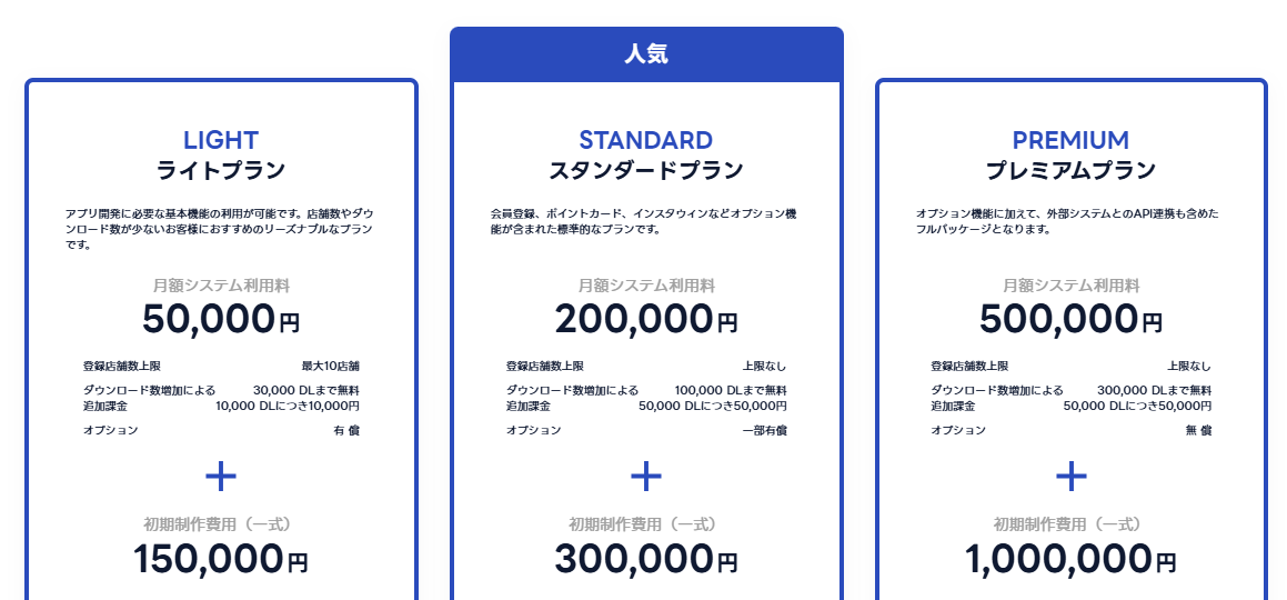 料金はプランにより異なります。ライトプランでは初期制作150,000円+月額50,000円(店舗数最大10店、DL数上限無料分あり)。スタンダードやプレミアムなど上位プランではAPI連携やオプション機能も含まれ、月額最大500,000円程度、初期制作は300,000円~1,000,000円程度(税抜)です