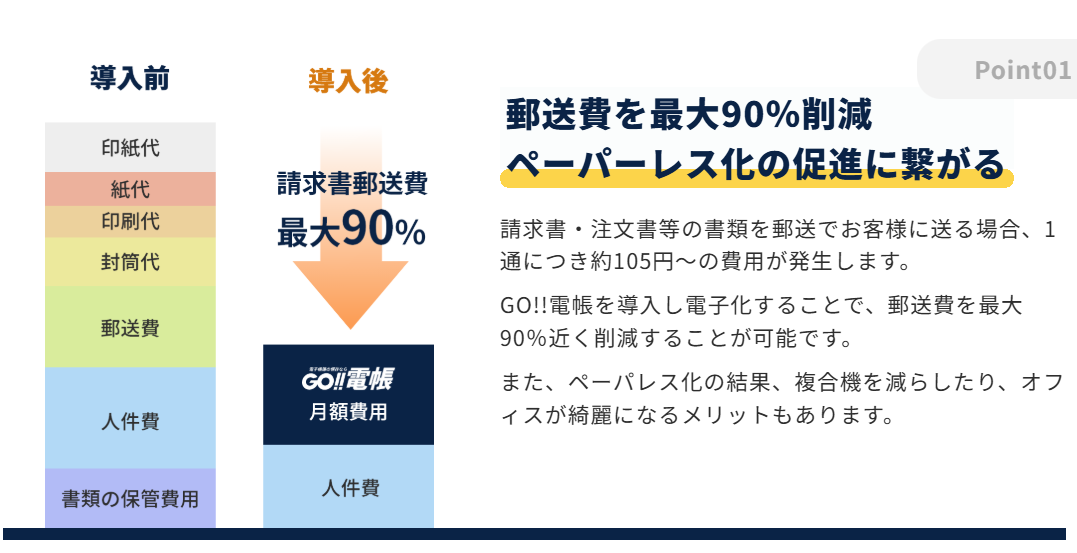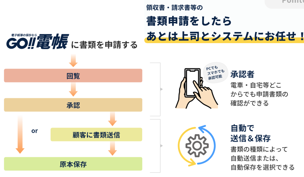 GO!!電帳は、電子帳簿保存法に対応した文書管理クラウドで、AI-OCR、ファイルサーバー、ワークフロー、ダッシュボードなどを一体化。特許取得かつJIIMA認証取得済みの堅牢な設計で、改ざん防止や保存要件(10年間)を満たしつつ、使いやすさとコストパフォーマンスに優れ、中小企業のDX化を支えます