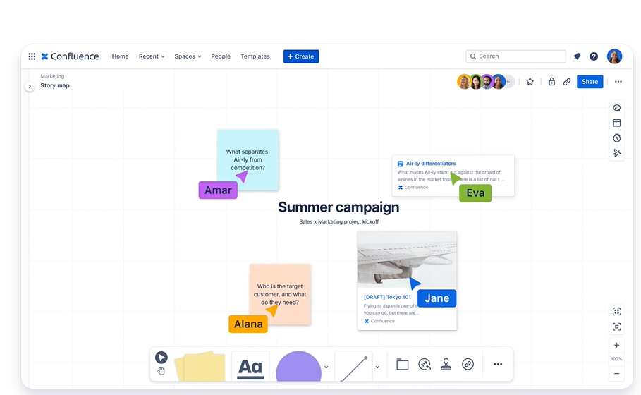 Confluenceは「スペース」と「ページ」による階層型構造でナレッジを整理。リアルタイム編集、コメント、@メンション、ページ履歴と差分比較などにより、情報の共同作成と管理を効率化し、プロジェクトの進行や意思決定の透明性を向上させます。