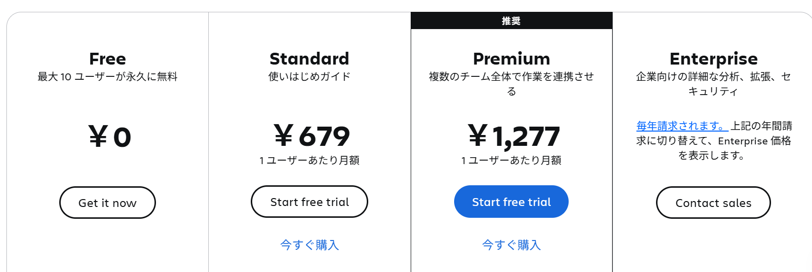 PremiumプランではAI要約・自動生成、分析(Analytics)、チームカレンダー、オートメーション、IP制限、無制限ホワイトボード、24/7サポート、高可用性SLAなどを提供。Data Center版は大規模・分散環境や業務継続に向けた高い可用性・エンタープライズ管理機能を備えています。