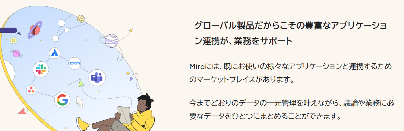 Miroは130以上のアプリ連携(Jira、Zoom、Teamsなど)やインテリジェントテンプレート、アクションショートカット、開発者向けSDKやAPIまでカバー。AI搭載により効率的なワークフロー構築と、独自カスタム機能の拡張が可能です。