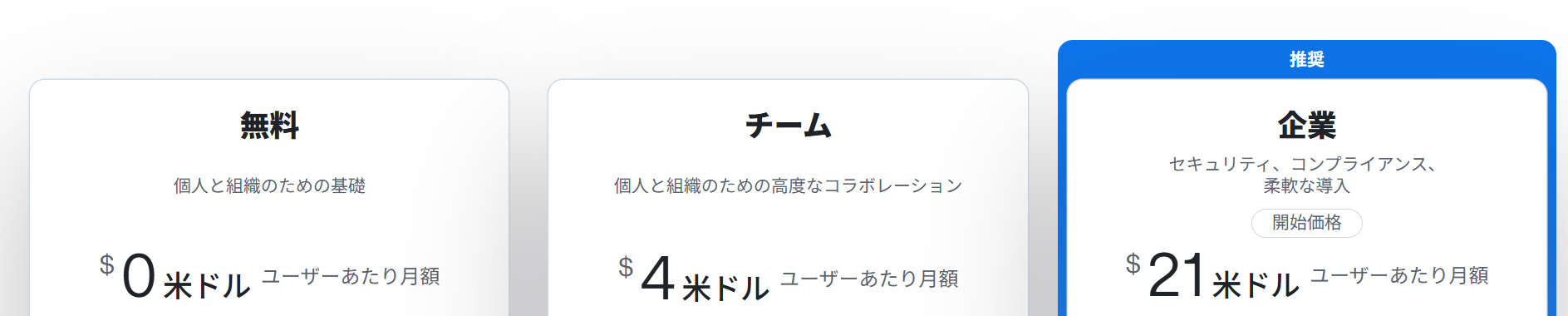 **Free**:無料で公開・プライベートリポジトリおよび2,000分/月のActions Minutes。**Team**:約US\$4/ユーザー/月(年額)から。**Enterprise**:約US\$21/ユーザー/月(年額)から。エンタープライズ契約は年3,000~95,000USDの規模になる場合あり。
