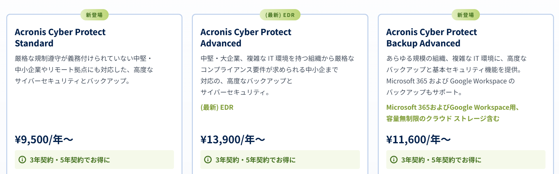 ワークロードごとの固定課金のほか、保存容量に応じた従量課金も選択可能。オンプレ/クラウドストレージの組み合わせにより、コスト最適な運用が実現できます。例:仮想マシン1台+Acronisクラウド50GBで月額JPY 3,410円程度。