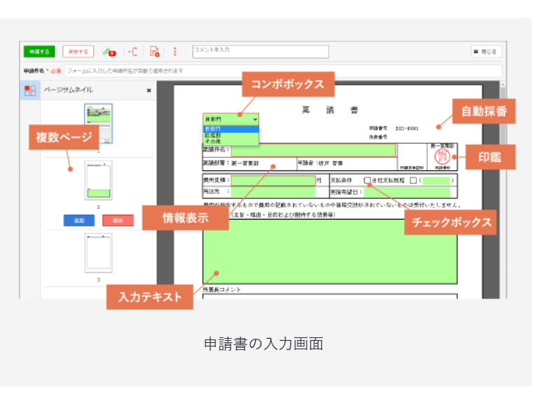 紙の稟議書やWord/Excel/PDFの申請書をそのままワンクリックで電子フォームに取り込み、現場に違和感なく移行できます。フォーム上で押印やPDF貼り付けも可能で、申請と資料の確認がスムーズに完結します。