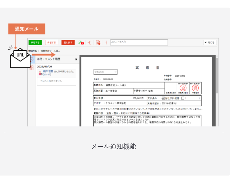 紙の稟議書や申請書をExcel・Word・PDFからワンタッチで取り込み、従来のレイアウトをそのまま電子化できます。ドラッグ&ドロップで承認ルートを直感的に設計でき、多様な外部サービスとの連携対応により業務効率化と内部統制を強力に支援します。クラウド版は初期費用ゼロ、1ユーザー月額約500円~、パッケージ版は柔軟な導入構成が可能です。導入・運用時にはサポート体制も充実しています。
