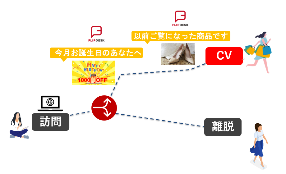 ①サイト訪問者の行動別に、ポップアップや、バナーでコンバージョンを誘導し、離脱を防止します。