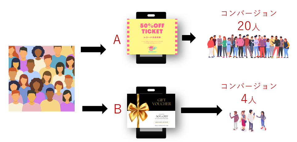 ABテストの役割はずばり、「誰がどんなコンテンツに興味を持ちCVまでの距離に近いのかを探し出す」ことです! お誕生月の人にクーポンをプレゼント!でもどんなコンテンツで訴求をするのが効果的なのでしょうか?その時に役立つのがABテストです。 Flipdesk(フリップデスク)では簡単にABテストを設定できます。 テストの結果はクリック率・コンバージョン率がレポートで簡単に見ることができるので、ABテストの勝ちパターンをすぐに見つけ出すことが可能です。