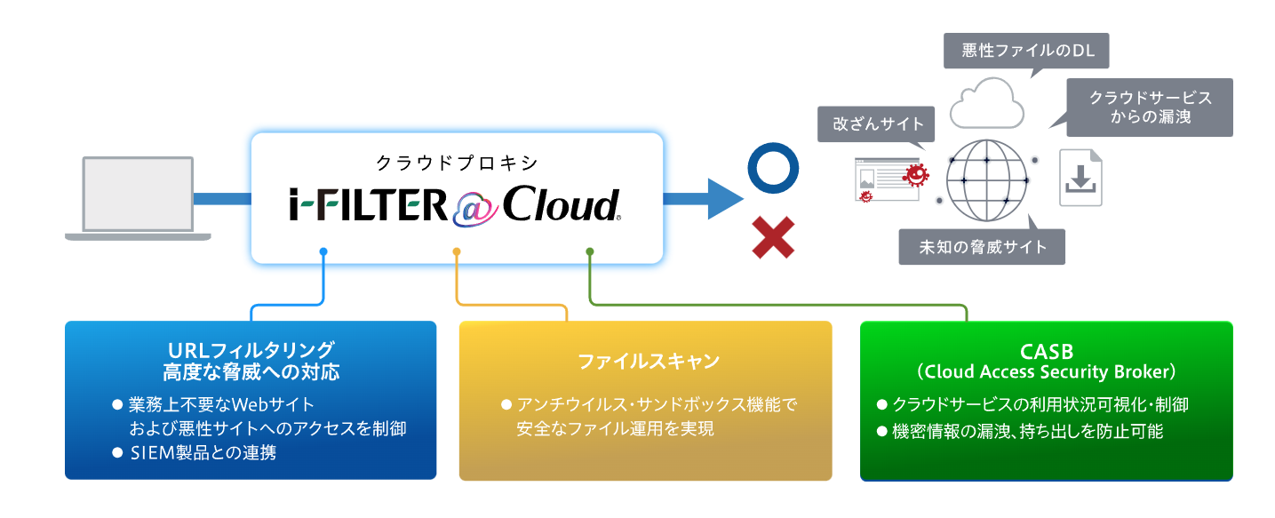 i-FILTER@Cloudは、クラウド基盤で動作するWebフィルタリングサービスです。業務に不要なサイトや危険なサイトへのアクセスを遮断し、情報漏えいやウイルス感染のリスクを低減。クラウド型のため拠点や端末を問わず適用でき、在宅勤務や外出先からの利用にも対応します。従業員の業務集中を促進し、セキュアなネットワーク環境を実現します。