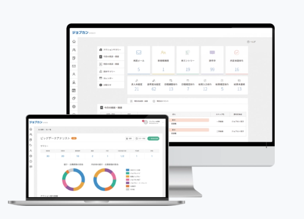 ジョブカン採用管理は、Donuts社が提供する採用管理システム(ATS)で、中途・新卒・アルバイト/パートといったあらゆる採用形態に対応。求人媒体との自動連携(Indeed・Googleしごと検索など)・LINEでの候補者連絡・選考プロセスの進捗可視化・応募者情報の整理/分析機能など、採用業務の効率化に必要な機能が揃っている。無料プランや低価格プランがあり、初期コストを抑えて試せるのが強み。既に多くの企業で導入実績あり。