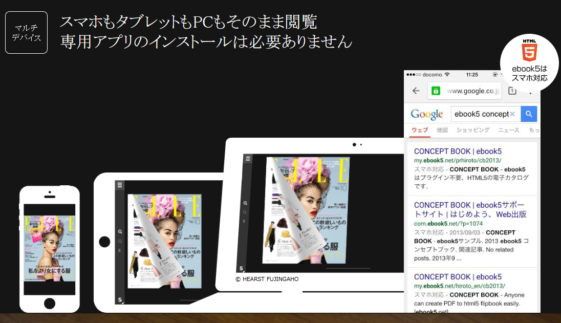 ebook5は、PDFファイルをアップロードするだけで簡単に電子ブックへ変換できるサービスです。ページめくりのアニメーションや拡大縮小機能など、紙の本に近い感覚で閲覧可能。カタログ・パンフレット・社内マニュアル・会報誌など、多様な用途に利用できます。クラウド配信により、PC・スマートフォン・タブレットなどマルチデバイスで閲覧でき、URLやQRコードを通じた共有も容易です。